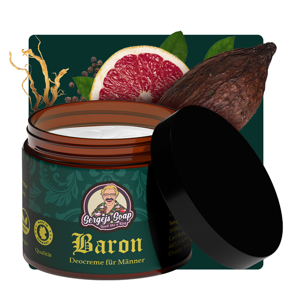 Die Baron Deocreme basiert auf reinster Sheabutter und schützt Dich bis zu 24h vor Schweiß. Sie duftet nach Kakao & Grapefruit.