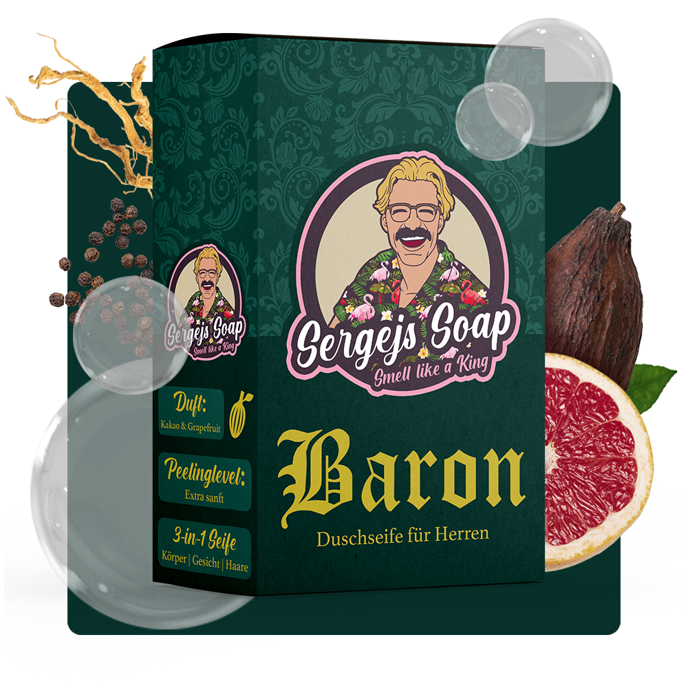 Der Baron ist eine 3-in-1 Duschseife für den täglichen Gebrauch. Sie duftet nach hochwertigen Kakao & Grapefruit.