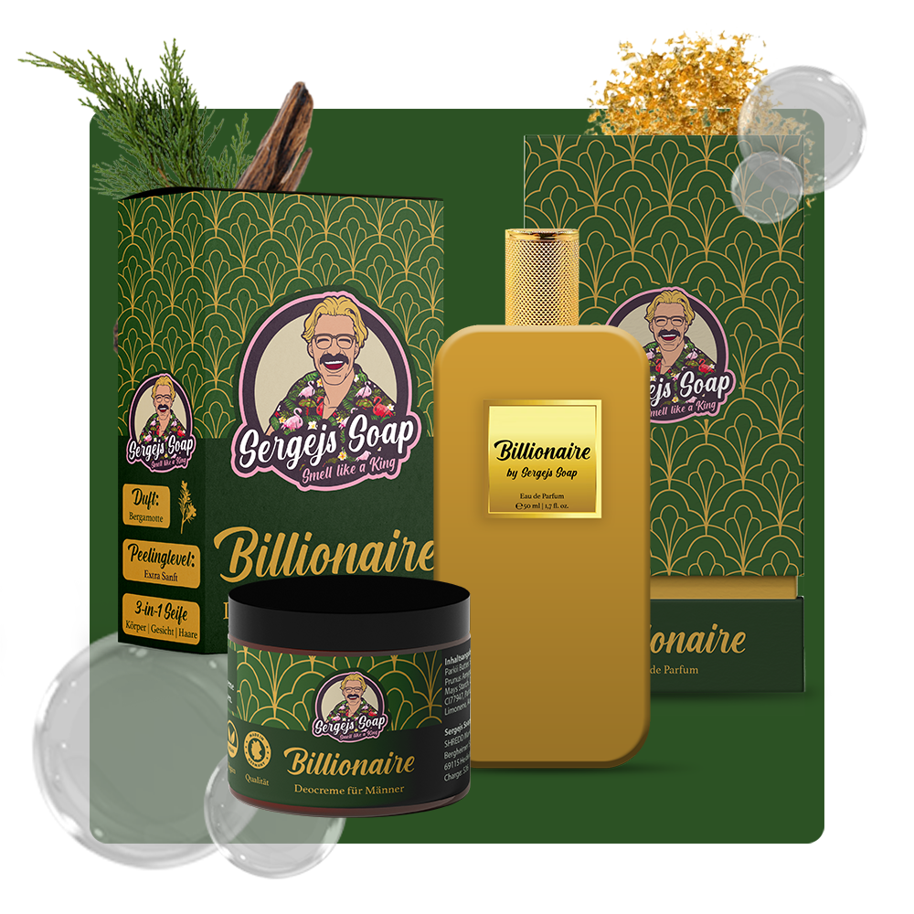 Das Billionaire Gold Set enthält 1 x die Billionaire Seife, 1 x die Billionaire Deocreme und 1 x das Billionaire Extrait de Parfum. Die Artikel duften nach Oud, Zypresse, Bergamotte, Patchouli & Tabak.
